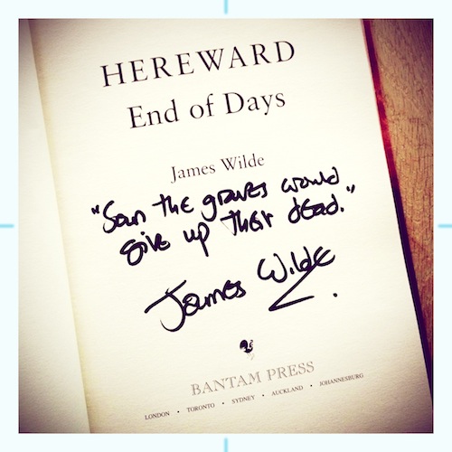 So, the End of Days would also seem to be the end of James Wilde’s Hereward books. That is of course presuming it is just a trilogy. Hereward has been fresh and riotously entertaining. An in-your-face, unforgettable meeting with one of English history’s original ‘forgotten’ heroes. James Wilde has succeeded in turning Hereward into a vital, living, breathing, death-dealing, honest, fallible, believable human being. A worthy adversary for William and the Normans. My attention and anticipation has been held fast all the way through, by glorious, addictive story-telling and good old-fashioned, can’t turn the pages fast enough, reading enjoyment of the finest kind. I do hope the good Mr Wilde can somehow find a way to keep Hereward going in some form or other. The character of the knight Deda would seem to offer some positive avenues, though would possibly take him into areas already occupied by James Aitcheson‘s ‘Tancred‘. The legend of Hereward has it that he either went into exile or carried on with his rebellious ways in the Fens or, a number of other possibilities. He didn’t die at the end of his struggles to rid England of the Normans and there is certain evidence for his exploits in hiding being the template for the later Robin Hood legend, so there might be scope for further novels.