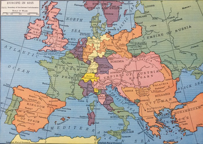The Congress of Vienna in 1815 re-fashioned the map of Europe after the downfall of Napoleon. England and France in the west; Austria and Russia in the east; survived as the strongest military powers. Germany and Italy were mere geographical expressions, completely lacking in national unity. The spirit of nationalism among the peoples of Europe, however, was not to be suppressed forever.
